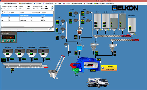 Шагая в ногу со временем, компания ELKON, используя гибкую структуру программного обеспечения от фирмы Geotek, применила в АСУ ТП (Автоматическая система управления технологическими процессами) новую линейку контроллеров S7-1200. Это позволило упростить исполнительную базу пульта управления и максимально расширить возможности нового программного обеспечения. Новый контроллер позволил использовать широко распространённую систему связи пульта управления с ПК по локальной сети через порт Ethernet, что дало оператору возможность в реальном масштабе времени осуществлять контроль над производством без каких-либо задержек в выводе информации на дисплей ПК. Так же изменения коснулись панели оператора LCD Siemens, которая тоже использует коммуникационный обмен данными с контроллером S7-1200 по локальной сети. Все значения, вводимые с панели, так же работают в реальном масштабе времени и позволяют оператору максимально качественно производить бетонную смесь при работе в ручном/автоматическом режиме, опираясь на показания панели оператора. Еще одним важным преимущество новых контроллеров S7-1200 является более гибкая система программирования, которая позволяет внедрить и расширить функции программного обеспечения без ущерба для каких бы то ни было функций всех систем завода.